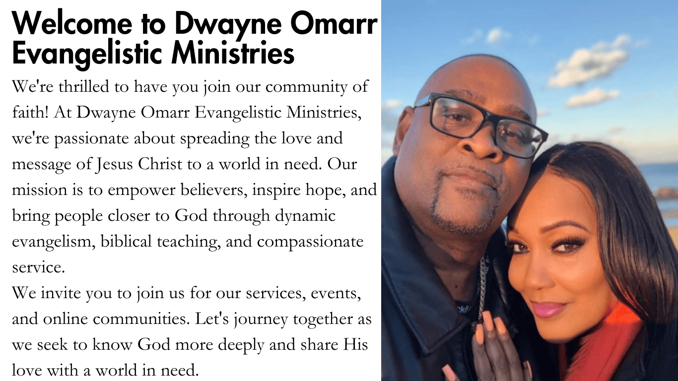 Dwayne Omarr Evangelistic Ministries Inc. is a 501(c)(3) nonprofit Christian organization founded by Prophet Dwayne Omarr Robinson and King Titus Robinson in California. Located at 40960 California Oaks Rd., Suite 2002, Murrieta, CA 92562, the ministry is led by Prophet Dwayne Omarr and his wife, author and model First Lady Sonya McFadden-Robinson, who are dedicated to advancing the Kingdom of God through their mission.